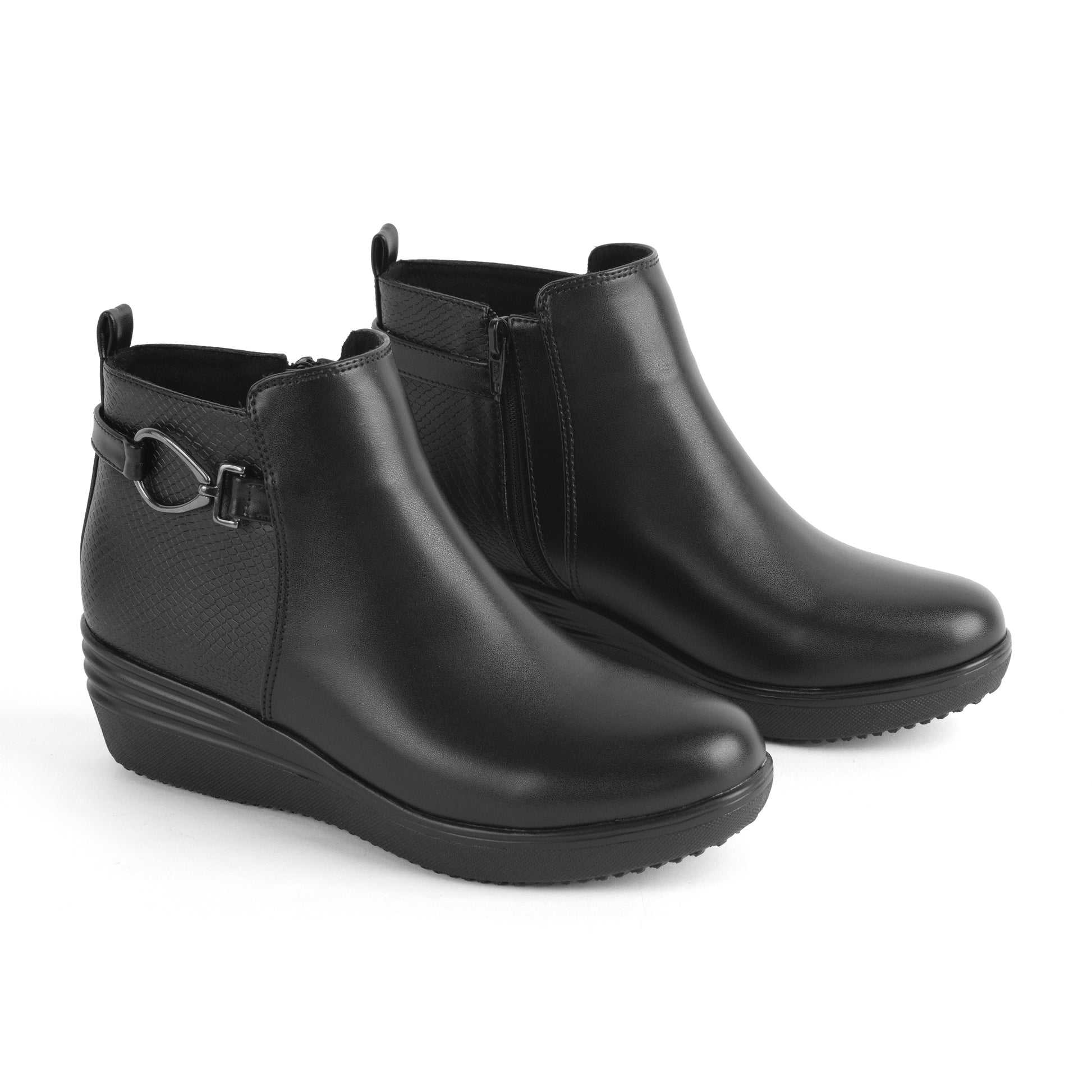 Descubre el Botín Mary Negro: plataforma baja, acabado texturizado y herraje metálico lateral para un look casual-elegante.