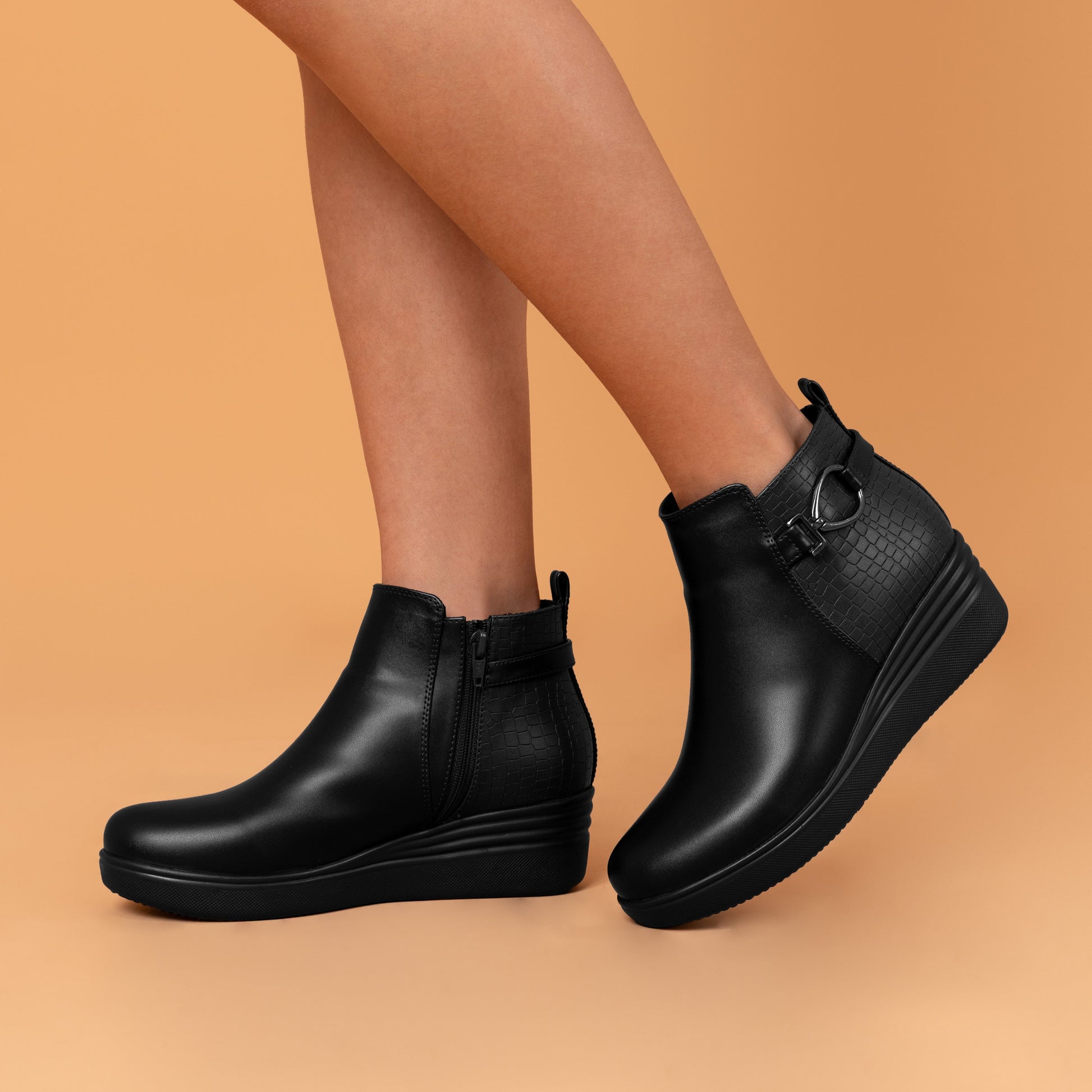 El Botín Mary Negro está confeccionado en cuero sintético premium con un atractivo detalle texturizado en el talón que le da personalidad. Su plataforma baja aporta altura sutil y confort, ideal para usar durante todo el día. La hebilla metálica lateral agrega un toque moderno y refinado, lo que lo convierte en un calzado versátil para combinar con jeans, vestidos casuales o looks de oficina relajados.
