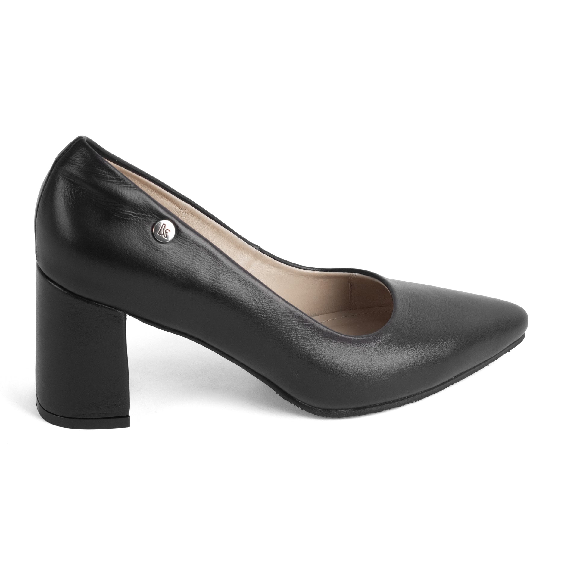 Descubre el Stiletto Kalu Negro: punta fina y tacón bloque en cuero natural, el equilibrio perfecto entre elegancia y comodidad para todo el día.
